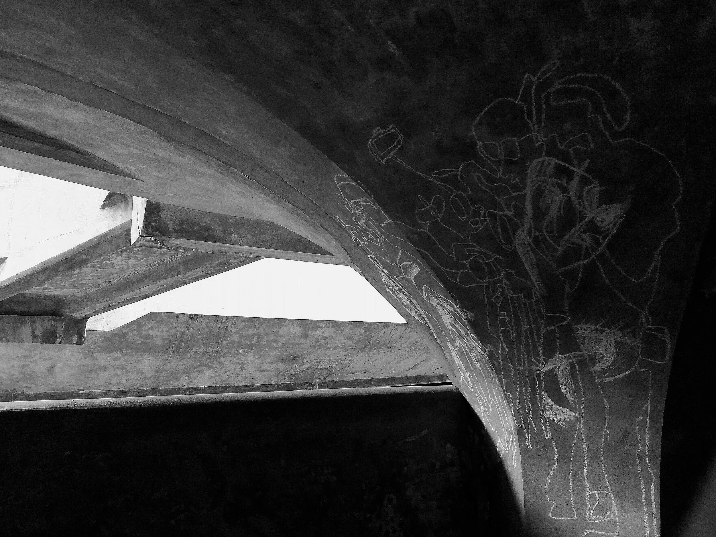 Idea: tunnel is like a portal between different worlds, and itself form a cave like context for the work. The idea of portal is reflected as dualistic black/white surfaces of the work, it connects two sides of the road, of environment and experience. People passing the tunnel leaves their presence to the tunnel in the form of ”cave drawing” as symbols, characters and connecting lines. Result is a “cave drawing” of everyday; events, experiences and environments as a host of intellectual and emotional connections that infused our lives with meaning beyond the basic impulses, is is a visual representation of things that we could remember and imagine.